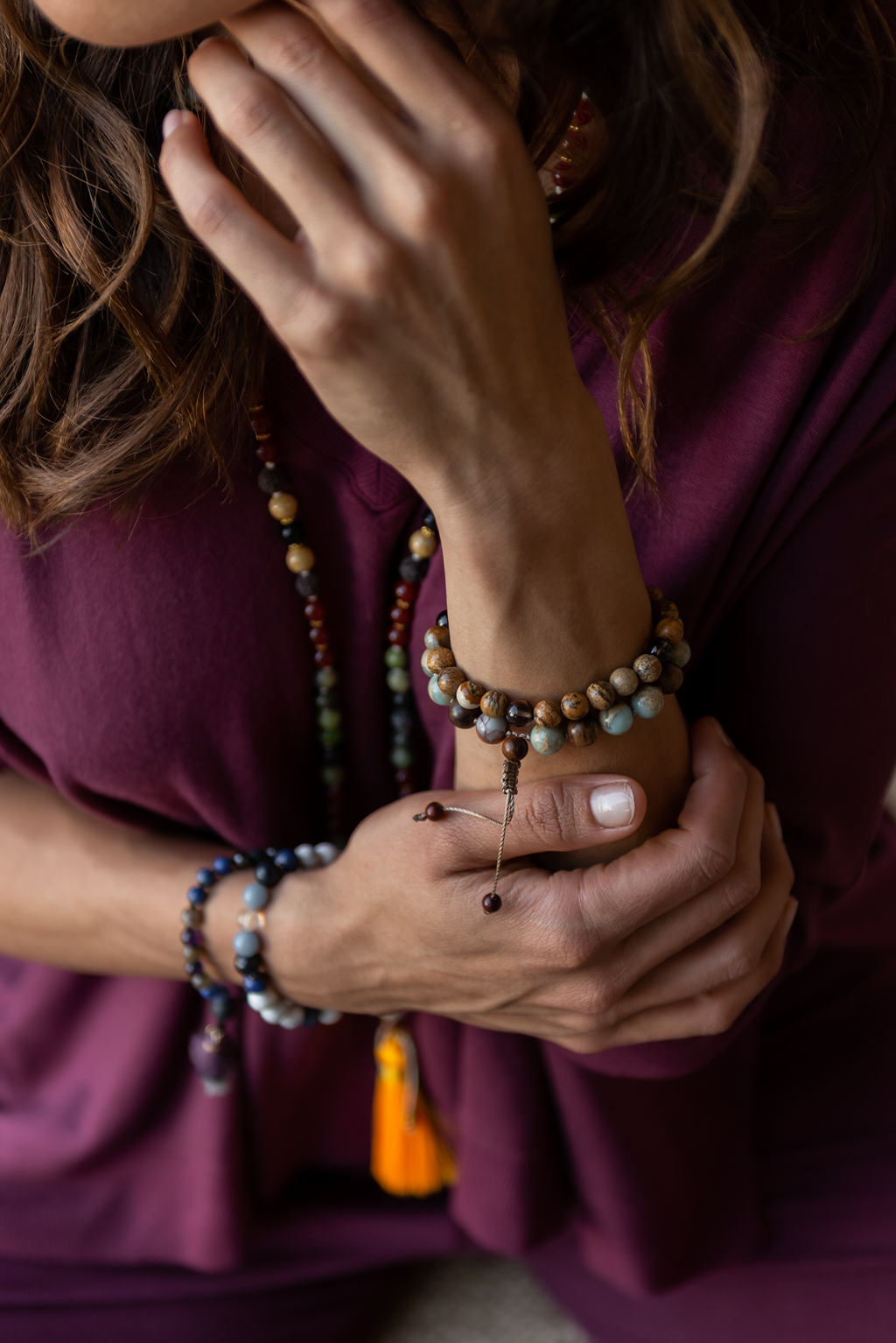 A connection with self and spirit allows one to feel whole, peaceful, and at ease. Understanding who you are, your purpose, and your relationship with the Divine is not only empowering, it allows you to live in ease and grace. We include Howlite in our Affinity Braceletas it is the symbol for purity and innocence, and aids in dispelling negative emotions. To strengthen the connection to the Divine, Angelite is present to raise our conscious awareness, and enhance communication with our spirit. Lapis Lazuli is brings one closer to enlightenment, and our inner wisdom, and dumortierite, while known for it's ability to increase patience, is used here to enhance our intellectual abilities. Lastly, Clear Quartz is present to act as an amplifier, increasing the potency and energetic reach and vibration of all of these gemstones.