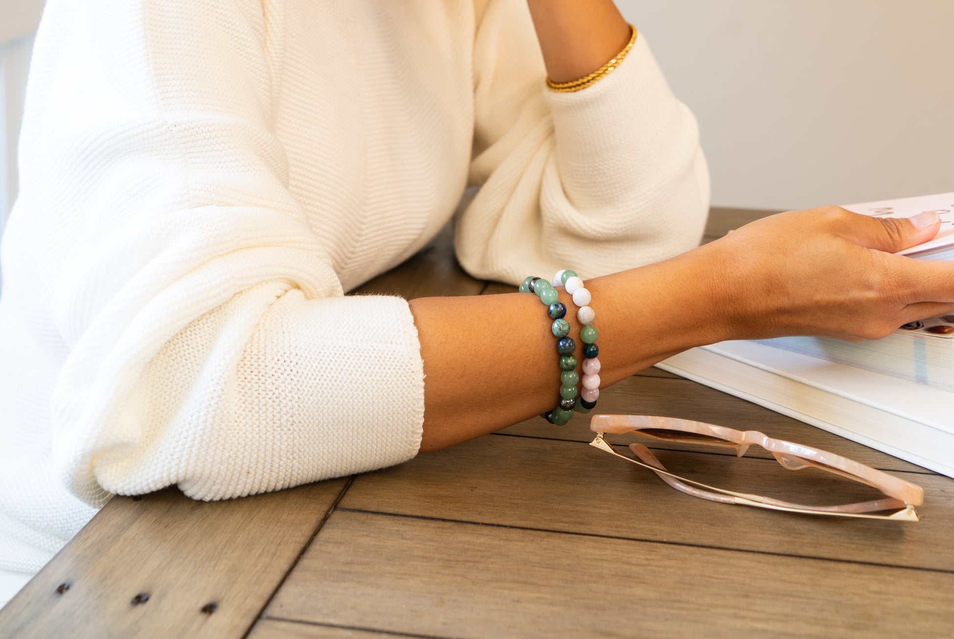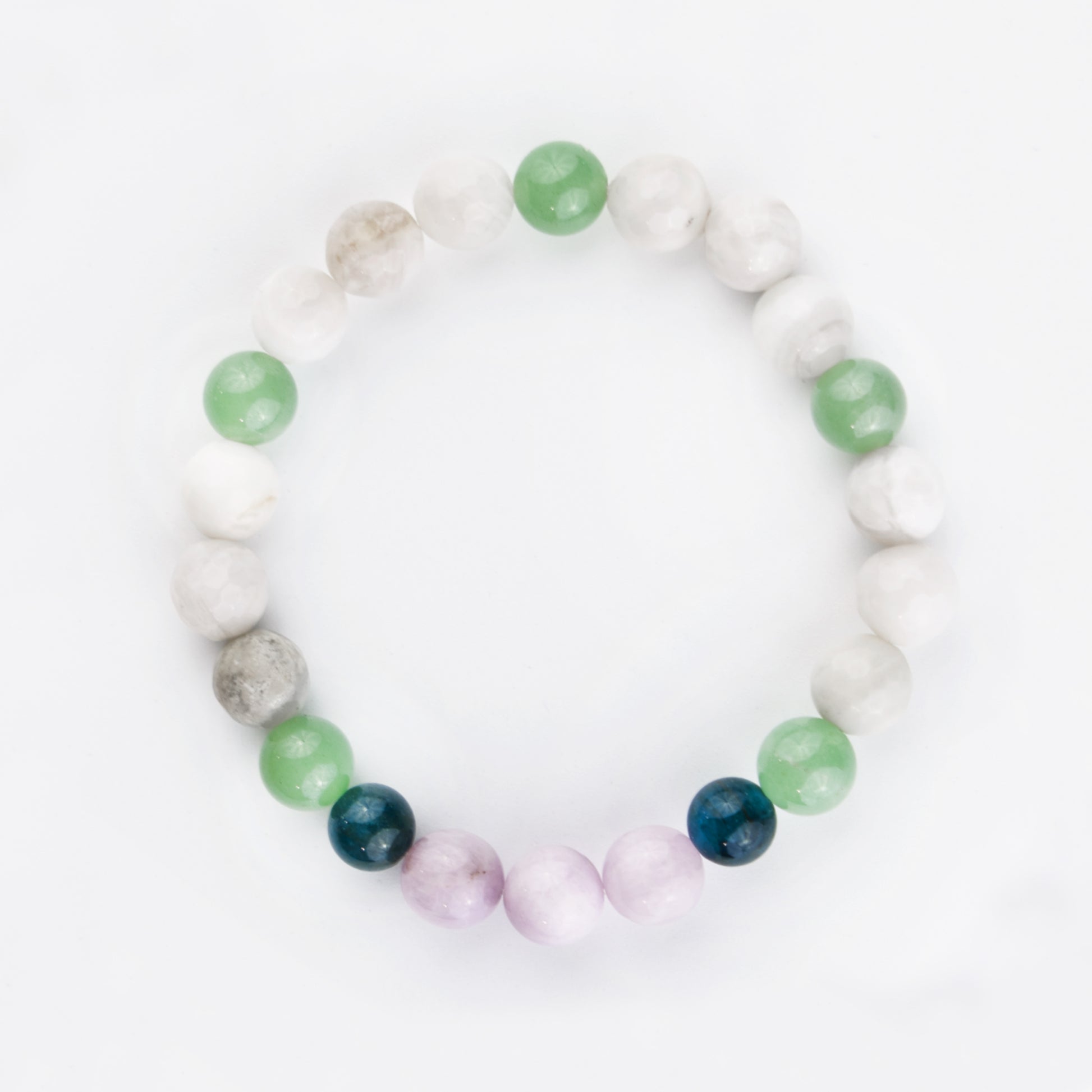 Know in your core that you are a divine creation that is deeply beloved! In this bracelet we use kunzite which allows us to see the Divine in everything - in others and ourselves - while removing resistance to what is best for us, as we strive to be better; white Crazy Lace Agate to promote fun, laughter, and unity; Aventurine to give off positive energy, while building camaraderie promotes friendship; and lastly, the comforting stone, Apatite, restores balance to physical and emotional body, opening the heart to accept Love given, instead of shutting people out.