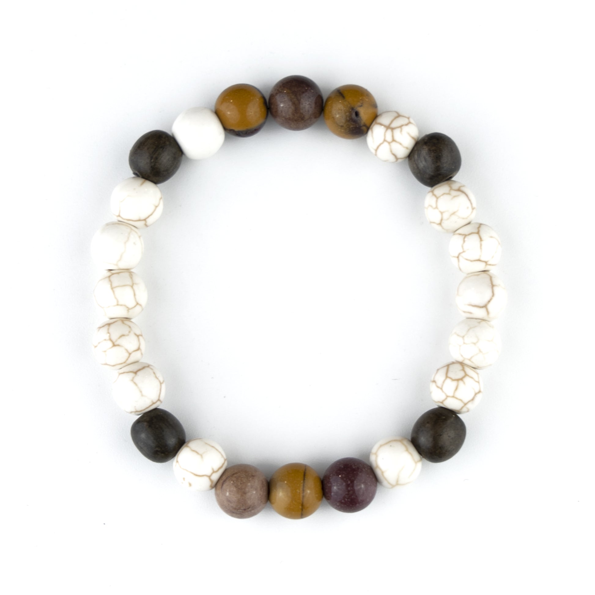 Walk sure-footed and stand in your power! Our Certain bracelet incorporates the grounding energies of Mookaite to give us a fresh perspective, allowing us to get out of our comfort zone, while providing a calm and tranquil sense of completeness. This supportive stone helps in decision making and adaptability, releasing anxieties and fears to encourage us to "live in the now"; Howlite offers clarity of thought, removing busy, overly- critical noise from the mind; and Grey Wood's grounding and nurturing energy lets us feel stable and safe.