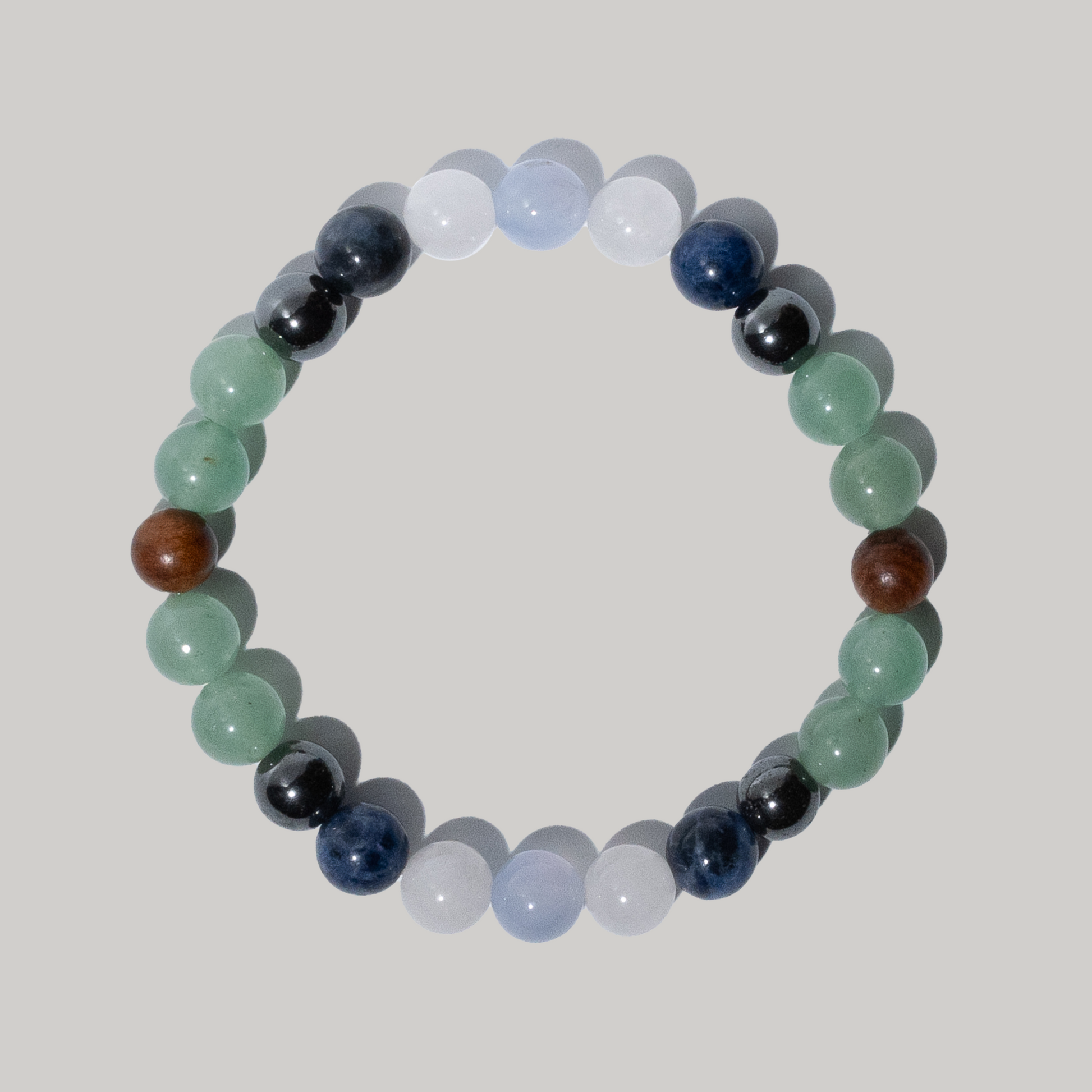Everything is energy, and therefore energy connects us all. Aventurine promotes harmony and balance, activates the heart chakra; white jade's calming energy is known to induce peace and serenity; sandalwood, sodalite, sandalwood inspires our deep rooted connection and growth toward a higher understanding; chalcedony quiets the noise so that we can reach a clearer, deeper connection with others, hematite's strong, protective energy releases negative thoughts and reminds us we are safe and loved.