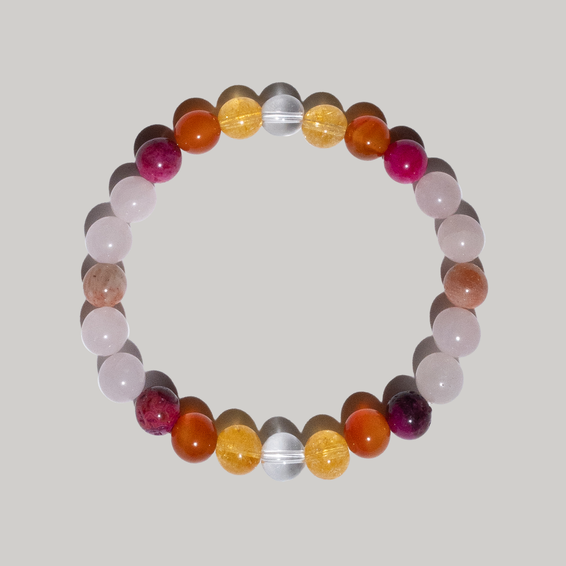 While it is known for it's ability to clear all chakras, Arusha Sunstone is also able to instill joy and enhance creativity. Citrine aligns with our own inner light, stimulating our happiness, positivity, and abundance. Carnelian boosts our confidence while encouraging creativity, Ruby Crazy Lace Agate is treasured for its ability to attract good fortune and joy, Rose Quartz fills us with a deep love for life, and the manifesting stone of Clear Quartz draws us closer to that which brings pure delight to our soul.