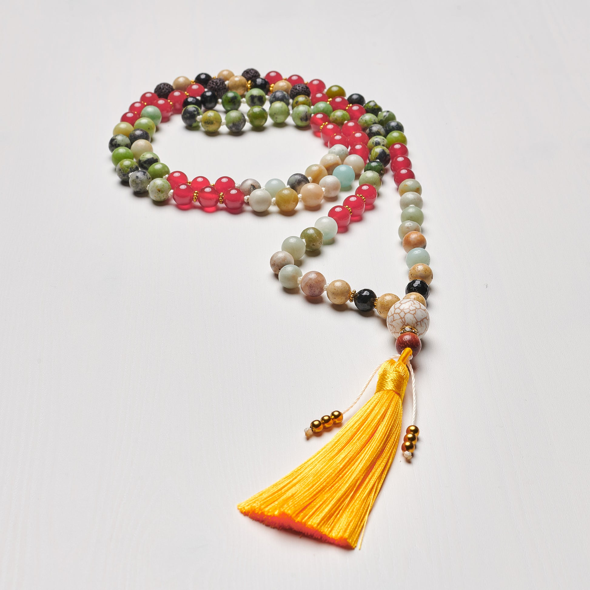 - Contents: Carnelian, Tourmaline, Chrysoprase, Amazonite, Yellow Riverstone, Howlite guru bead, Bayong Wood.