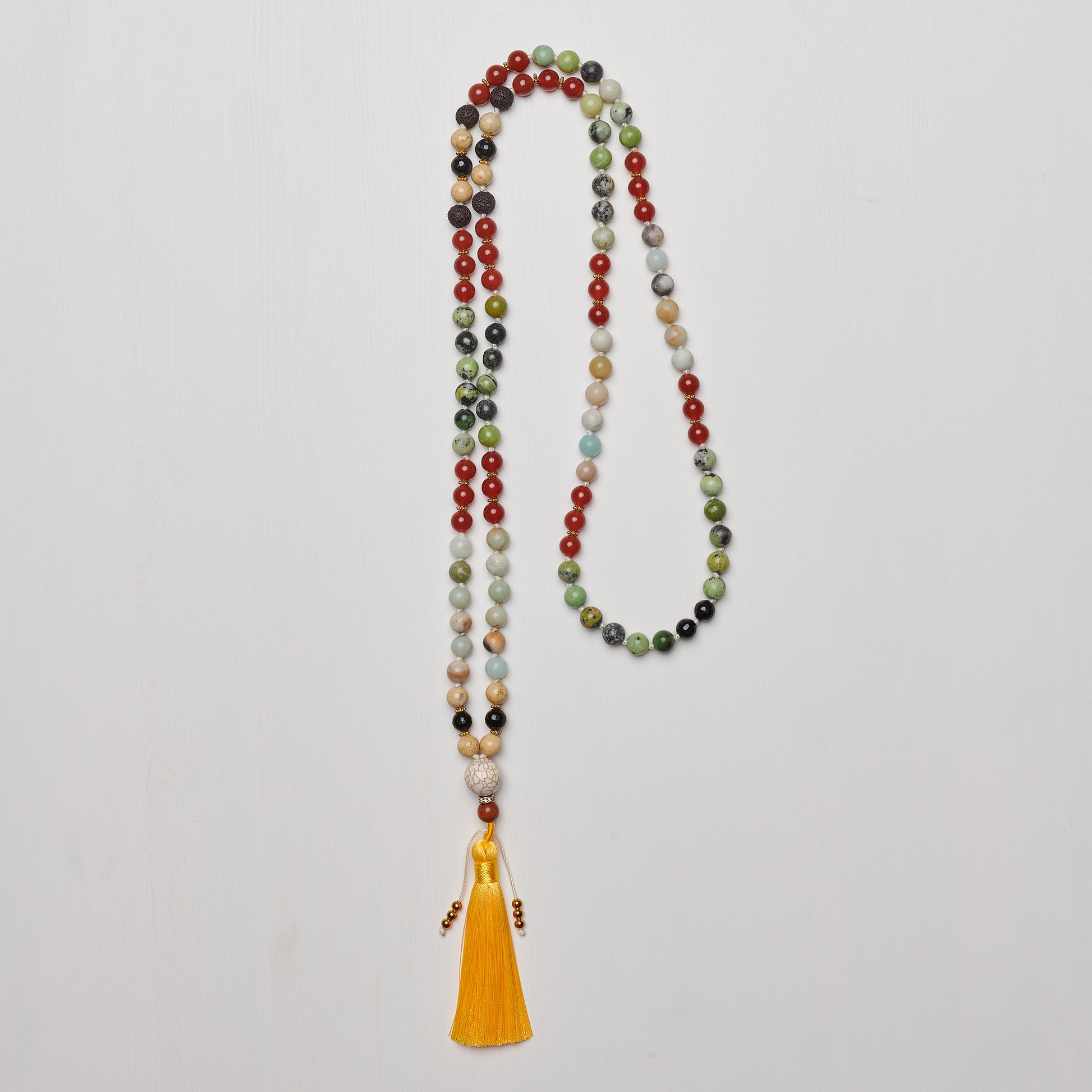 You've got this, you amazing soul! CLAIM IT! In this beautiful mala necklace, we use Carnelian, a stone known for it's ability to inspire confidence and to fuel your Passion. Feel safe and protected with the Tourmaline crystals interwoven, also helping to relieve any stress and dispell any anxiety as you press forward. The appealing green of chrysoprase attracts Prosperity and success, while promoting self acceptance and independence. This stone simutaneously activates the heart and solar plexus chakra, to help with healing, forgiveness, and comPassion. Also present is Amazonite: The Stone of Courage and Truth. This powerful gemstone empowers its' wearer to move beyond fear of judgement or confrontation with others to live in alignment with his or her own beliefs and values. This stone aids in setting strong and clear boundaries internally and externally. Yellow Riverstone is known to improve our energy flow, with a little bit of luck to make it all the more powerful! Theres an element of grounding with the presence of Bayong Wood, and the Guru bead of Howlite works to absorb and alchemize all negative thoughts and energy, transforming it into beautiful white light.