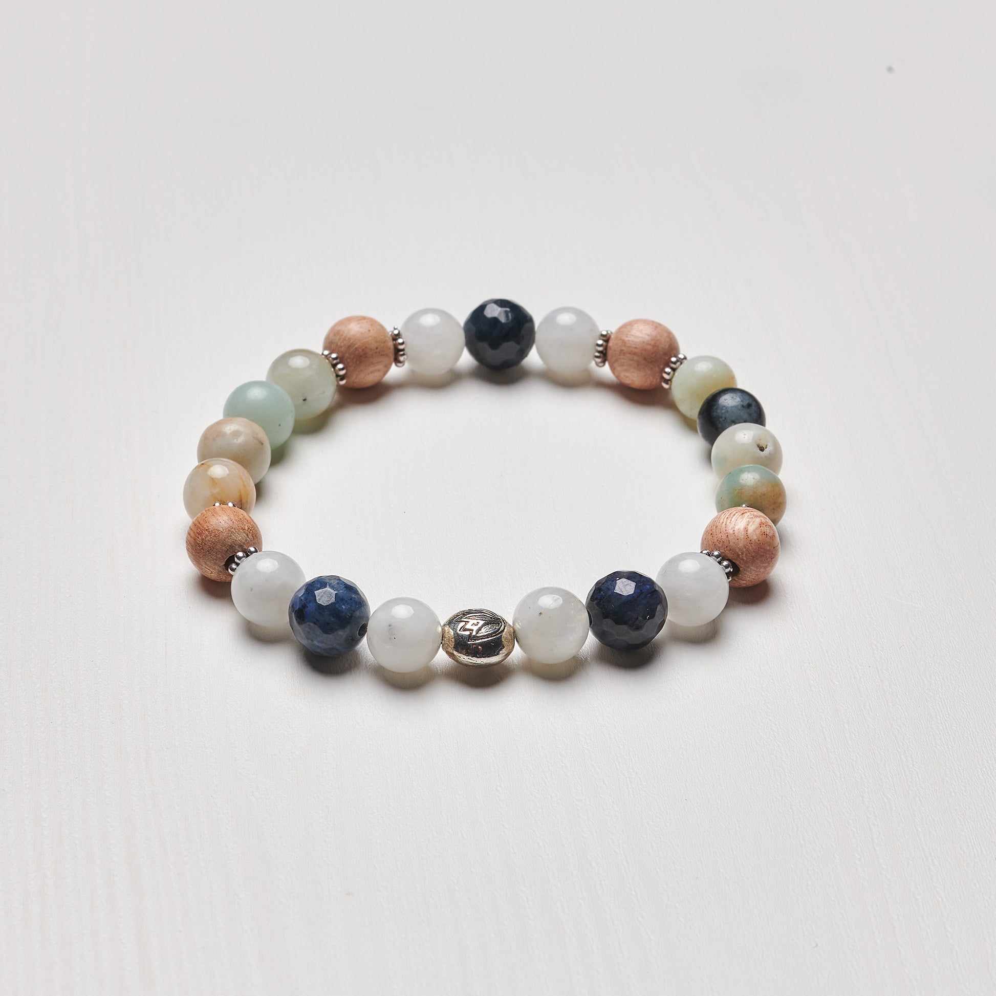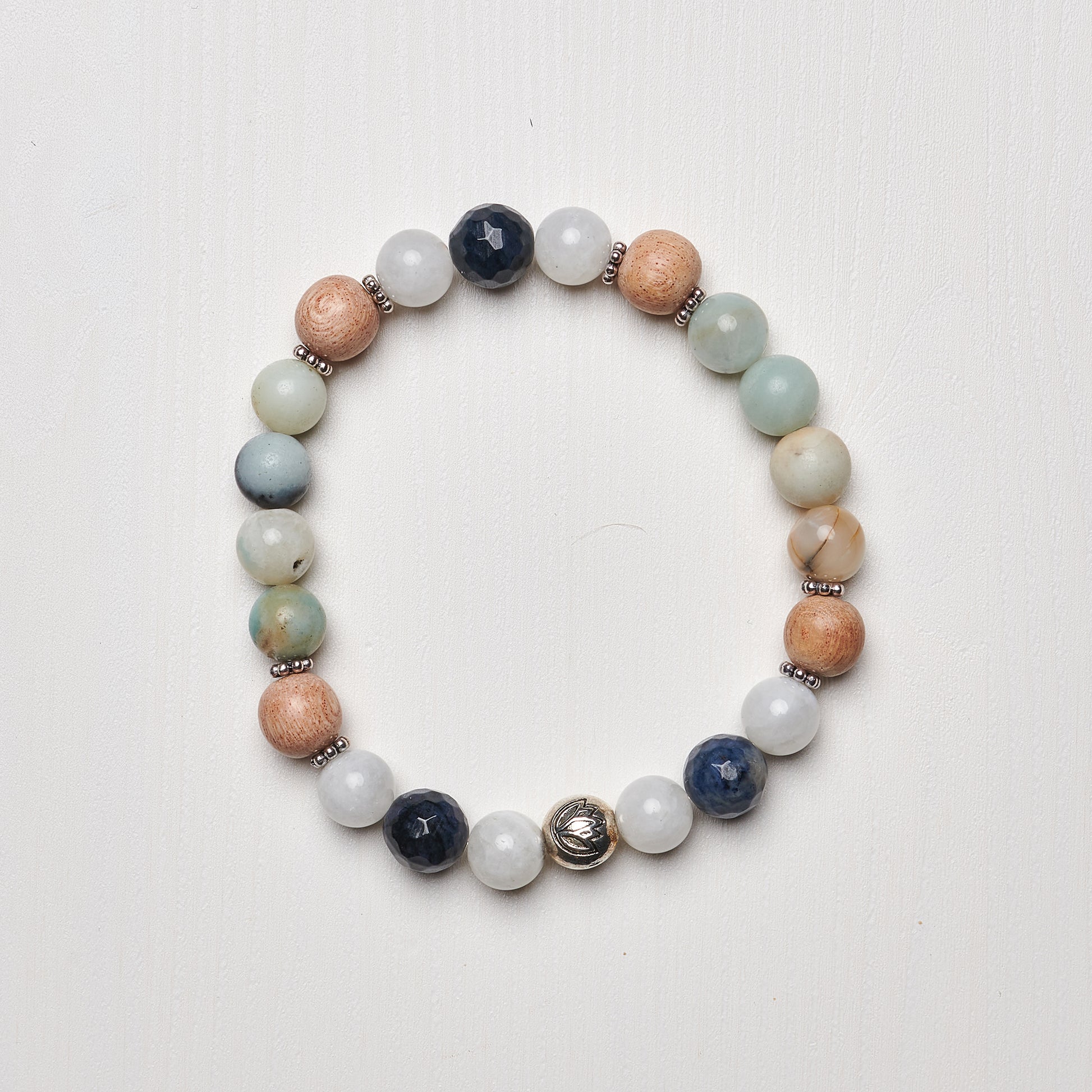 Raise your vibration and embody your highest self! This Braceletutilizes dumortierite to increase your intellectual abilities, clearing mental and emotional clutter and boosting patience. Moonstone restores your balance and brings you back to wholeness, clearing out any self-doubt and fears. Rosewood aides in grounding and taps into our heart chakra, accessing our comPassion and Love. Wearing Amazonite balances both masculine and feminine energies while providing harmony and alignment.