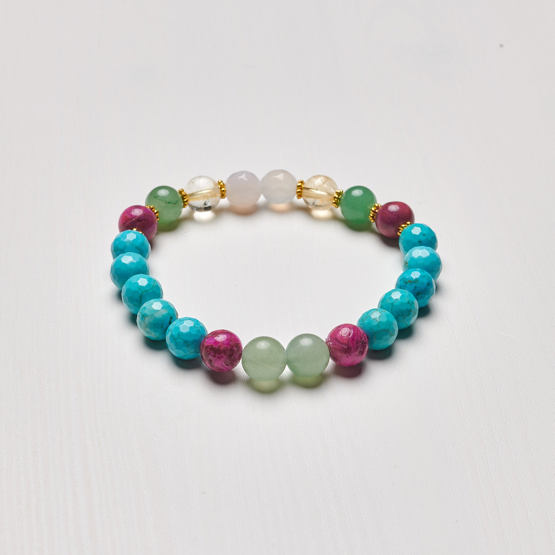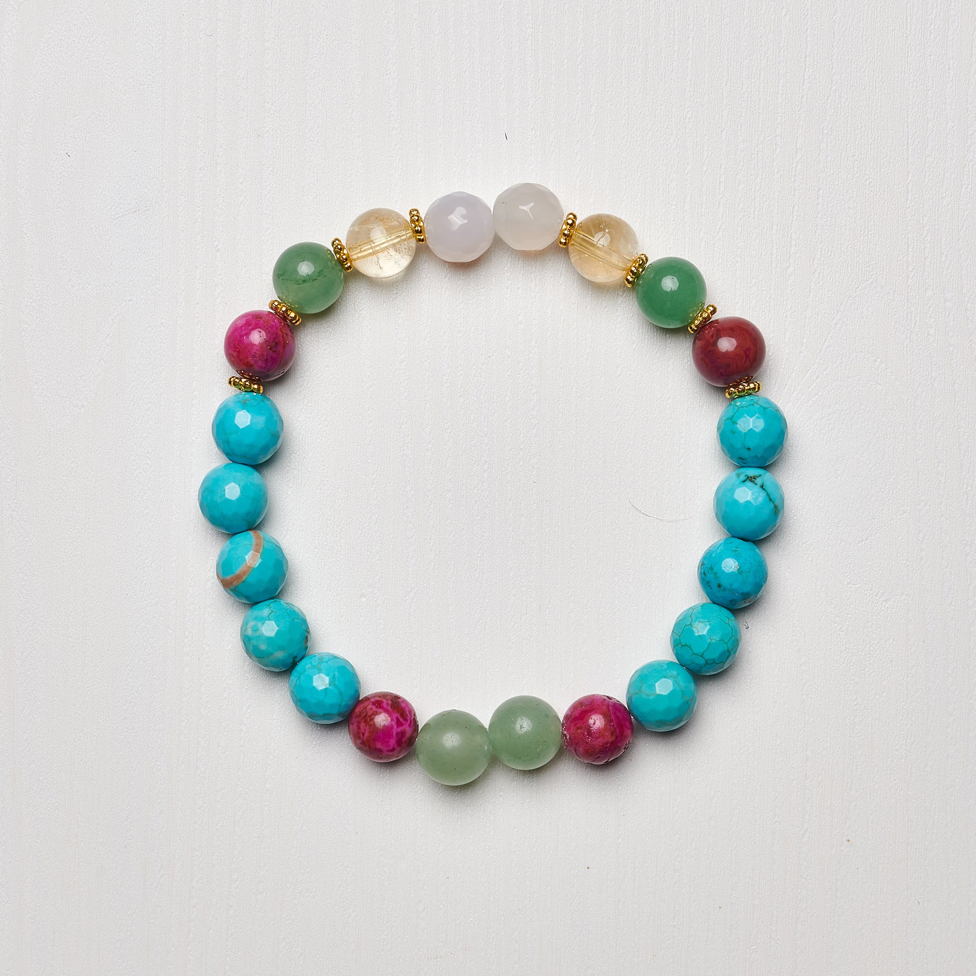Bring more positive energy into everything that you do! This beautiful Braceletis meant to instill hope and joy - and does it ever! The turquoise magnesite is a calming and relaxing stone that foster creativity and imagination, Crazy Lace Agate is known for imparting joy, happiness, and good luck in overcoming obstacles. All frustrations and anxieties disappear thanks to the white agate; wearing Citrine is empowering and uplifting; and Aventurine is a stone to help you manifest situations to go in your favor!