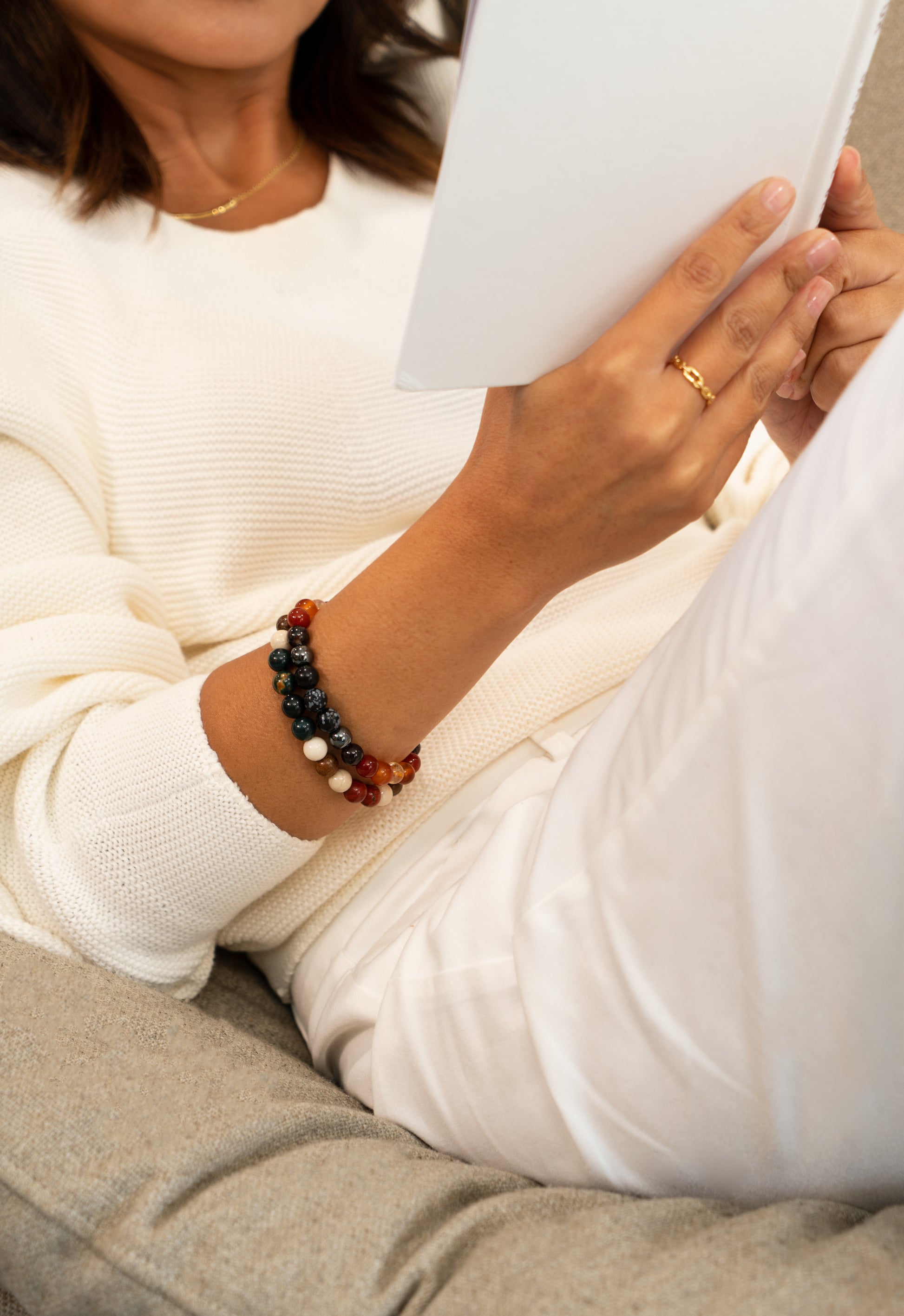 In the midst of life's chaos, find peace. This talisman utilizes snowflake obsidian, a calming and purifying stone that removes negativity that may block the free flow of energy, and balances our mind, body, and spirit. It activates both the root and 3rd eye chakras while focusing our attention, ridding any distractions; hematite, like armor, offers security and stability, rooting our physical existence back to the earth, allowing us to thrive in any situation; garnet, the stone of passion, love and connection; carnelian amplifies our vitality and warmth, evoking a sense of "home"; and lastly citrine glows with our crown chakra to connect to inner light, joy, energy of the sun.