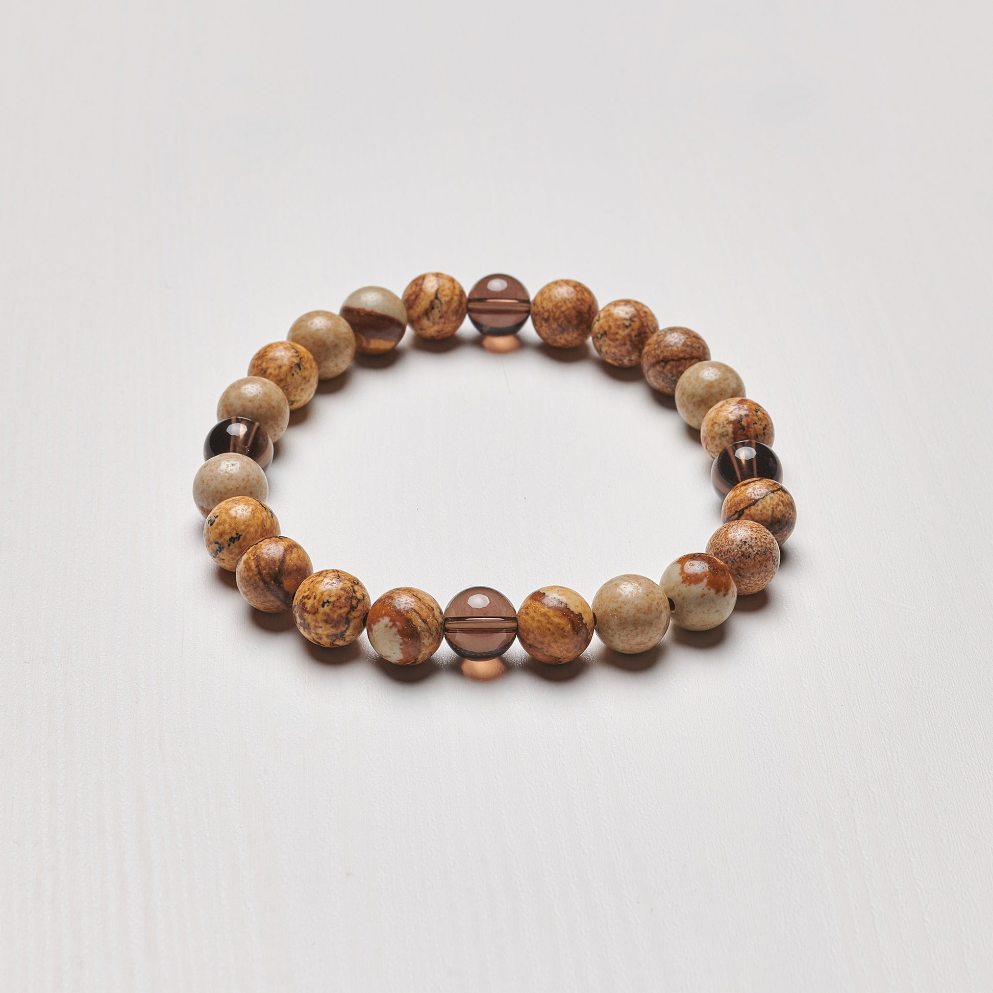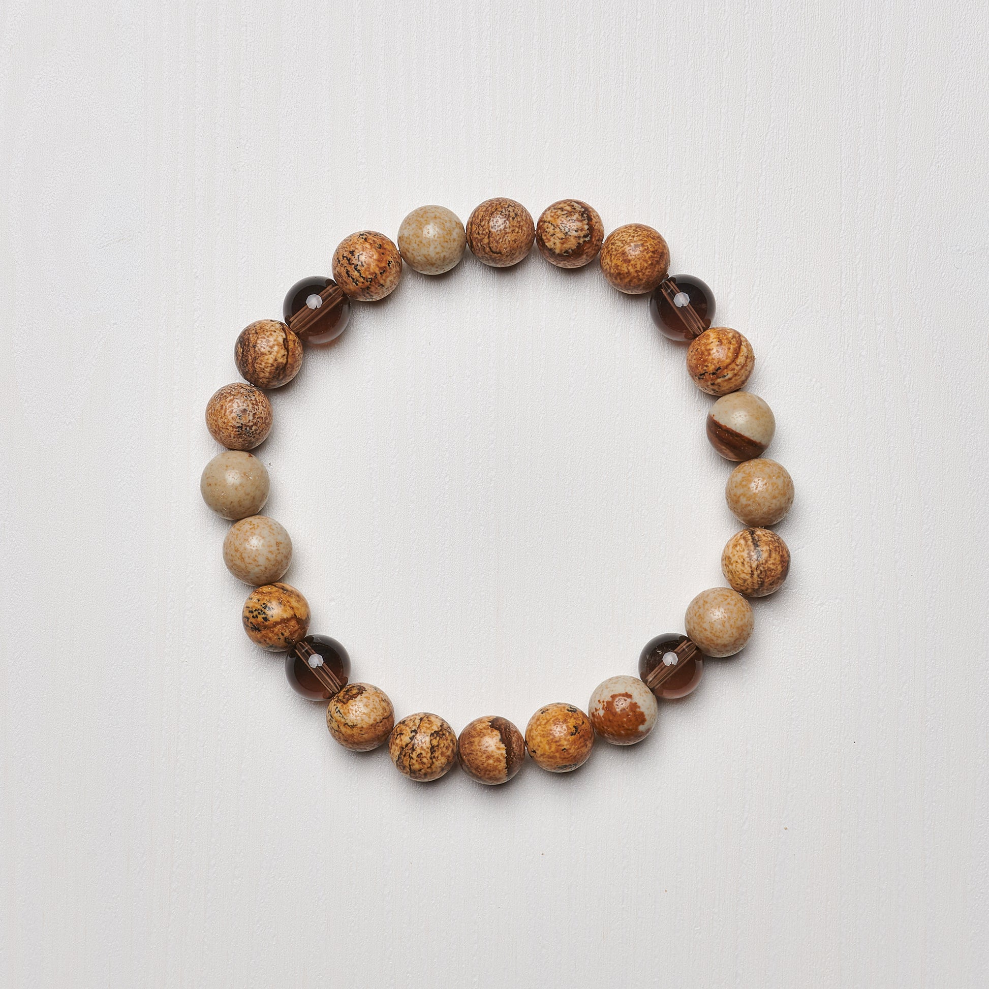 Tap into the energy of Mother Earth with our Root to Rise bracelet. Composed of picture jasper, which encourages initiative and inspired confidence, and Smoky Quartz, which relieves worry, tension, and negative thinking. Picture jasper helps us to stay grounded, in tune, and connected to the powerful, energetic, and life- giving vibration of Earth. Take root in this deep, established vitality, and grow, stretch, and rise to your highest potential. Smoky Quartz will protect you along the way, filtering out any ill-wishes, resentment, and disparity that can lower your vibration.