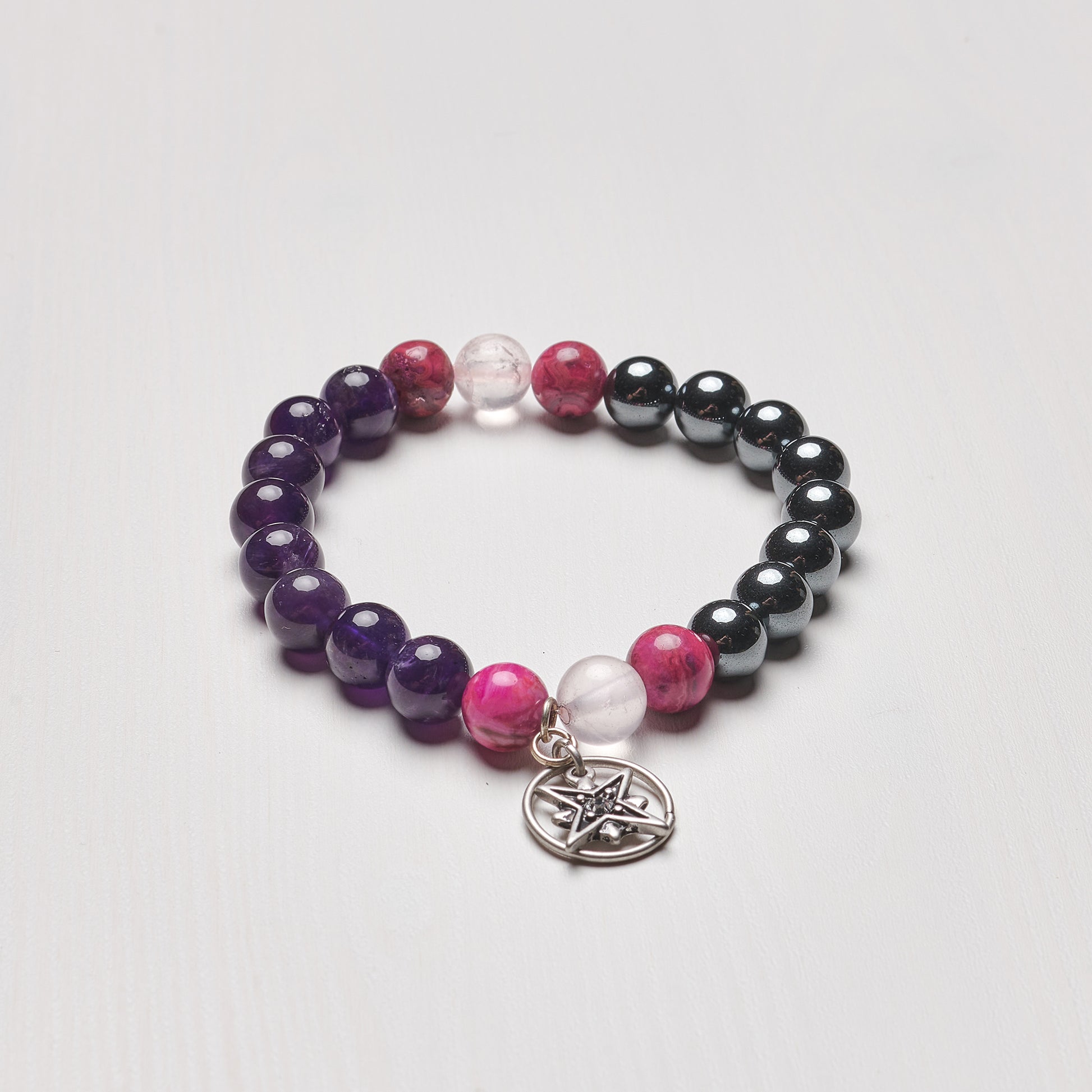 This piece is designed for overcoming obstacles and addictions, allowing deep healing, Love, and joy to take the place of fear, dependency, and unhappiness. Amethyst brings it power to heal the emotional wounds, Hematite keeps you grounded in truth, with the North Star to keep you on your course. Touches of Crazy Lace Agate bring about joy, and Rose Quartz nurtures our Self Love. With this bracelet, you are victorious!